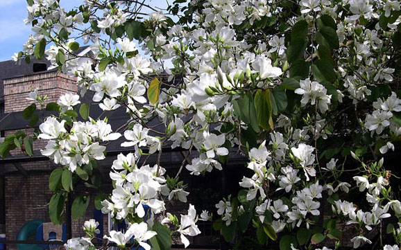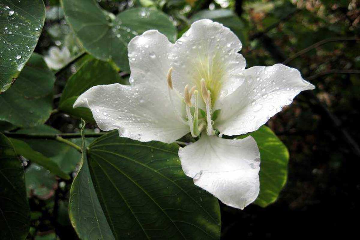 البوهينيا البيضاء شجرة شبه استوائية ذات أوراق مميزة الشكل، تتحمل الجفاف وظروف الحرارة العالية. أزهارها كبيرة بيضاء ذات رائحة عطرية فواحة. تتطابق البوهينيا البيضاء مع البوهينيا المبرقشة في الخصائص والصفات مع اختلاف لون الأزهار.