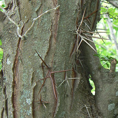 للشجرة أشواك ثلاثية حادة جداً تخرج من جذعها وتنمو مشكلة طوقاً شائكاً على الساق، وهذه الأشواك تحمي الشجرة من الحيوانات المتسلقة التي تتلف بذورها.